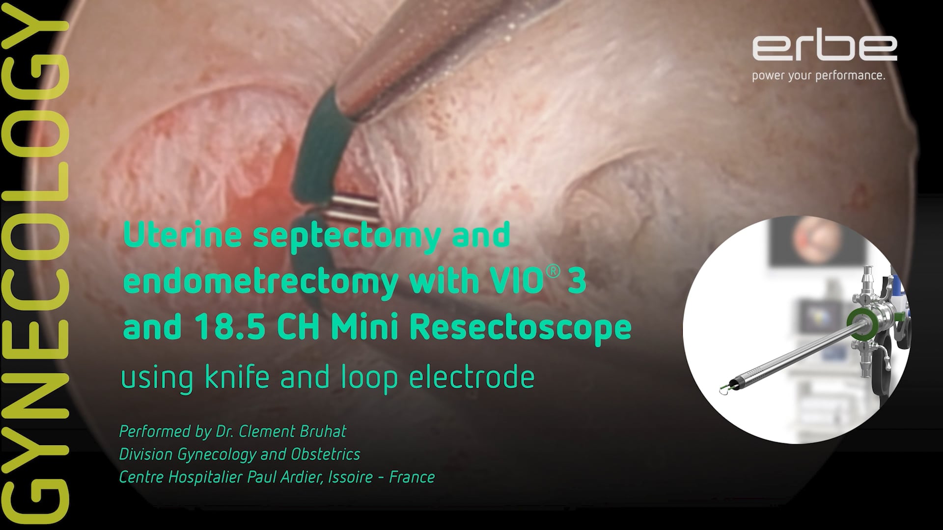 The video presents a hysteroscopic septum resection and endometrial resection (TCRE) performed with the VIO® 3 electrosurgical unit and the 18.5 CH Mini Resectoscope, carried out by Dr. Clement Bruhat at Centre Hospitalier Paul Ardier in Issoire, France. It demonstrates how combining the VIRON Imaging system, the VIO® 3, and the specialized resectoscope portfolio creates a comprehensive and efficient solution for clinical resection procedures. After the initial incision of the uterine septum, the step-by-step septectomy is performed using the highCUT mode, supported by stable plasma for rapid and precise cutting. Bleeding control is achieved with the softCOAG® bipolar mode, ensuring reliable hemostasis. The procedure continues with a hysteroscopic endometrial resection using the bipolar highCUT mode, highlighting the system’s cutting performance and visualization quality. The video offers a concise overview of modern, minimally invasive gynecological techniques enabled by an integrated resection solution.